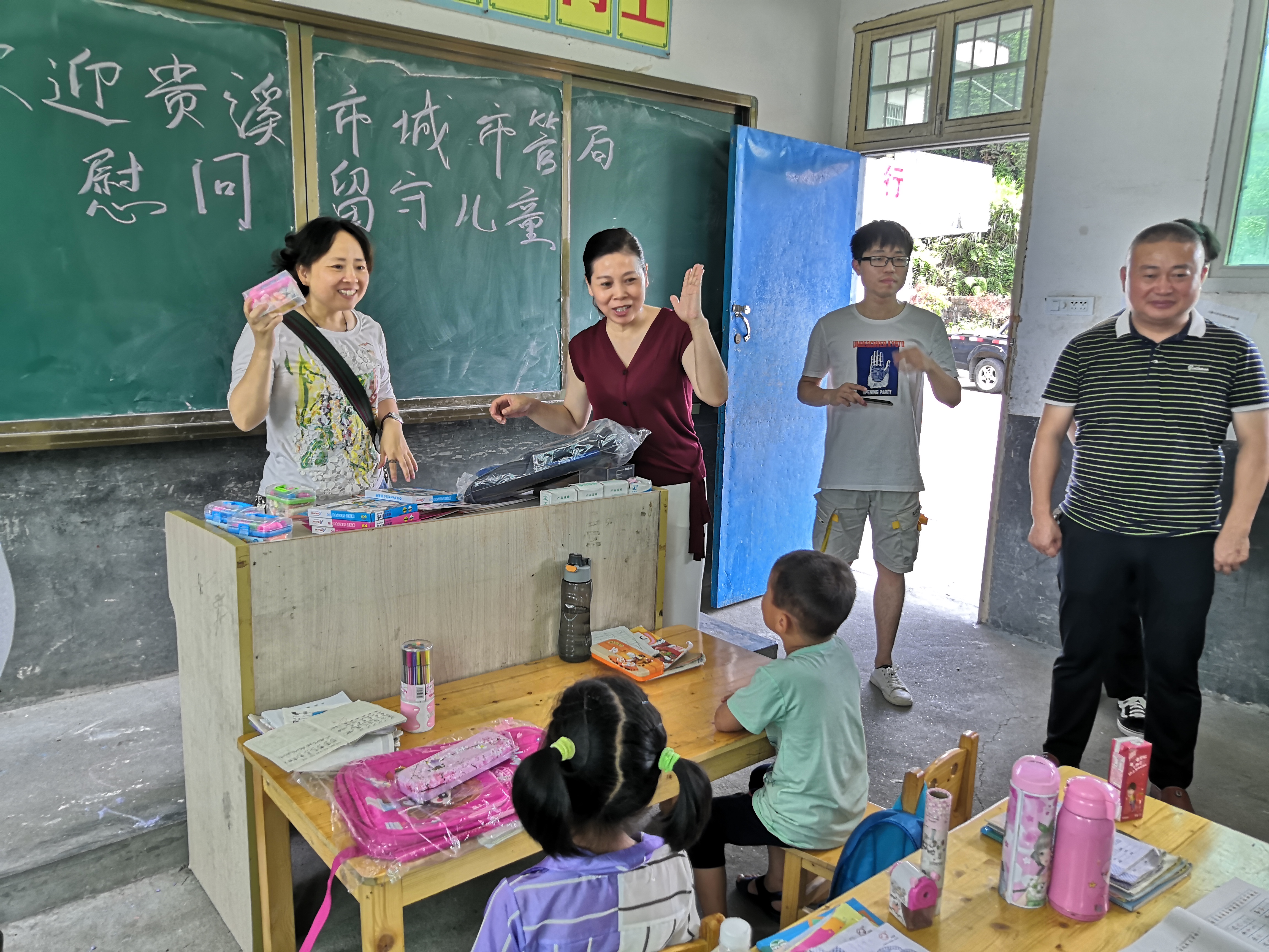 城管局扶贫干部慰问看望挂点村留守儿童,为他们送去学习用品。