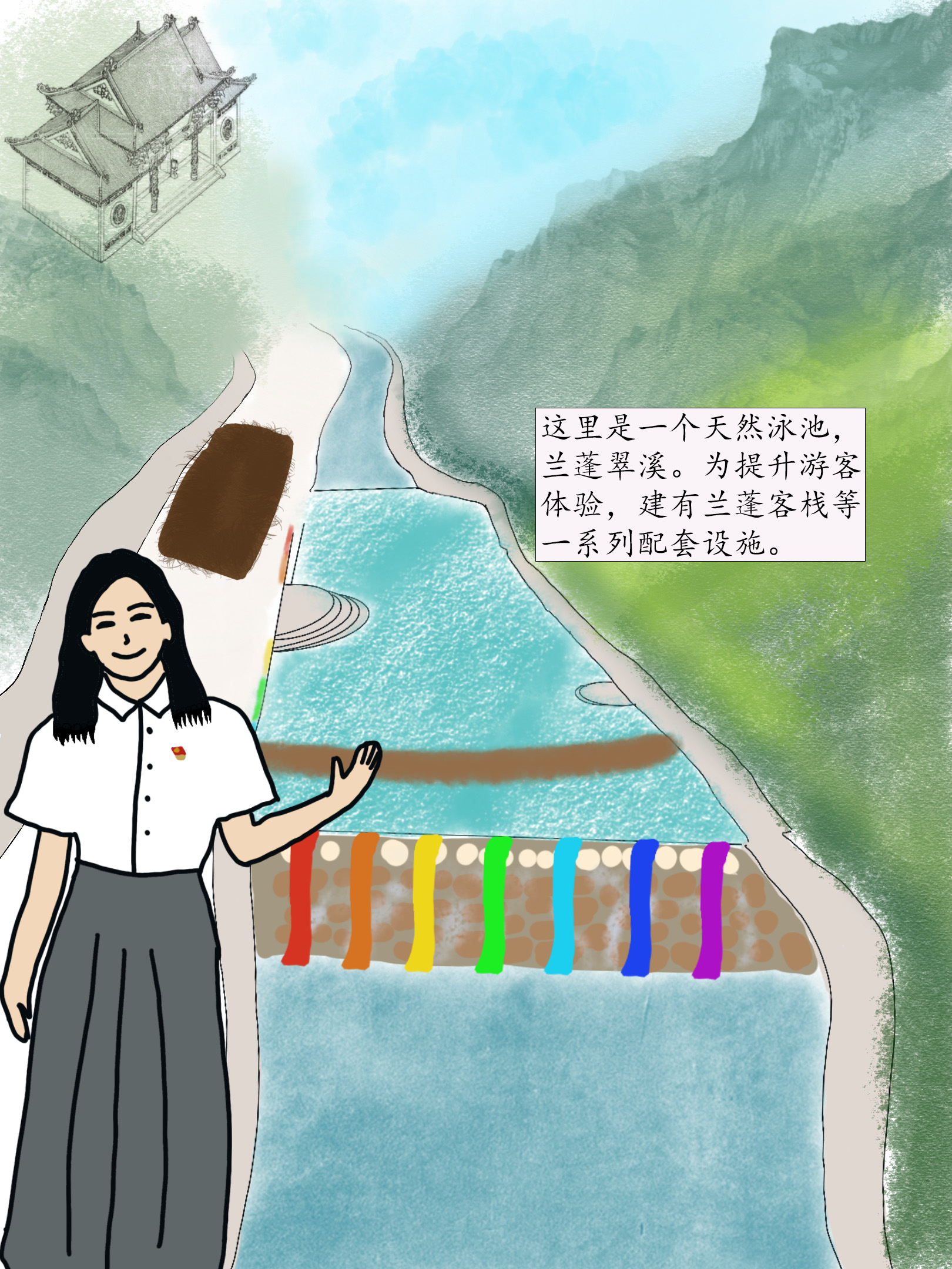 第二站兰蓬村。兰蓬村位于遂昌县西北部,是一个经济发展滞后的偏远的红色的山村。梭溪溪水流经兰蓬村时河段较宽,水平坡缓,周边重峦叠嶂,绿植覆盖。兰蓬村瞄准这一绿色生态优势,把握自身红色资源,结合水利项目,并积极与镇党委政府沟通讨论,最终决定合理开发利用起这段水域,发展乡村休闲旅游项目,以借水扬帆,破解“致富密码”。目前建设有天然泳池、浅水乐园、网红桥、浮桥、兰蓬客栈、公厕等基础设施,自运营以来,每年超万人次游玩,是炎炎夏日戏水玩水的好地方。