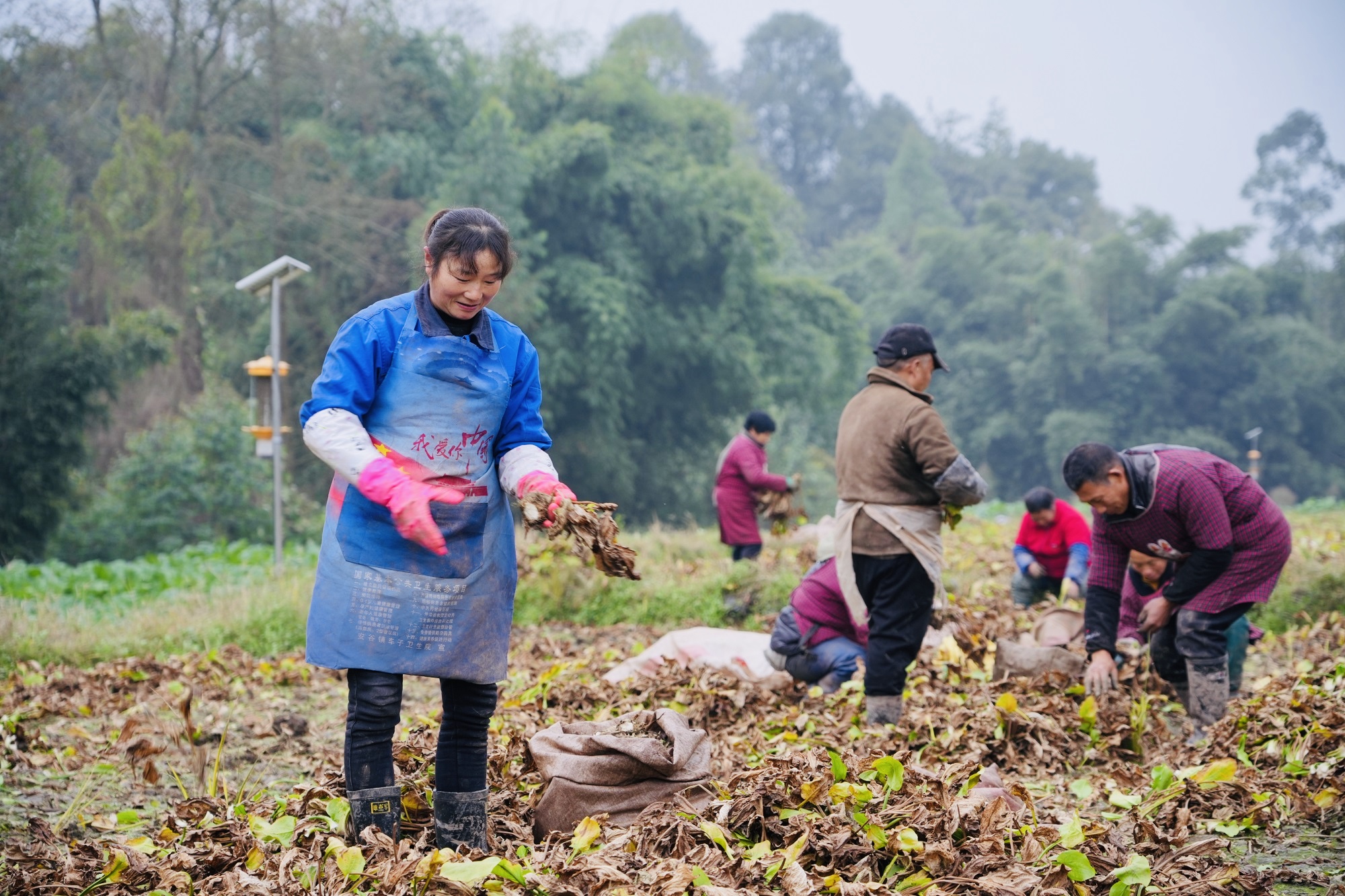 初冬时节,片片落叶、缕缕阳光、阵阵微风,汇成一首醉人的歌。在四川省乐山市五通桥区蔡金镇的农田里,农户们正在忙着采收中药材泽泻,一个个忙碌的身影,一块块拳头大的泽泻,成了田野中一道靓丽的风景线。
