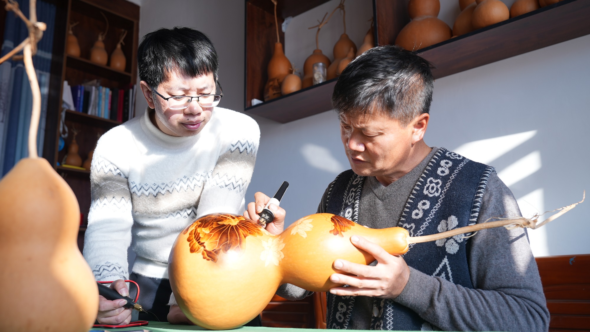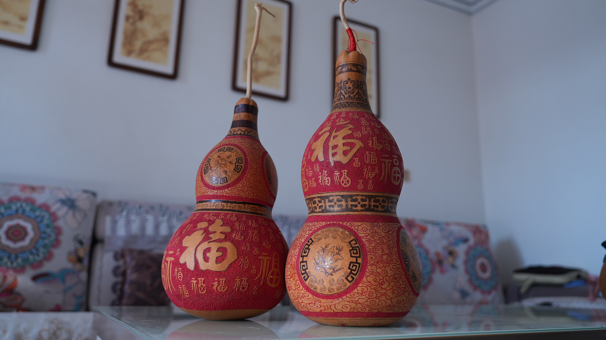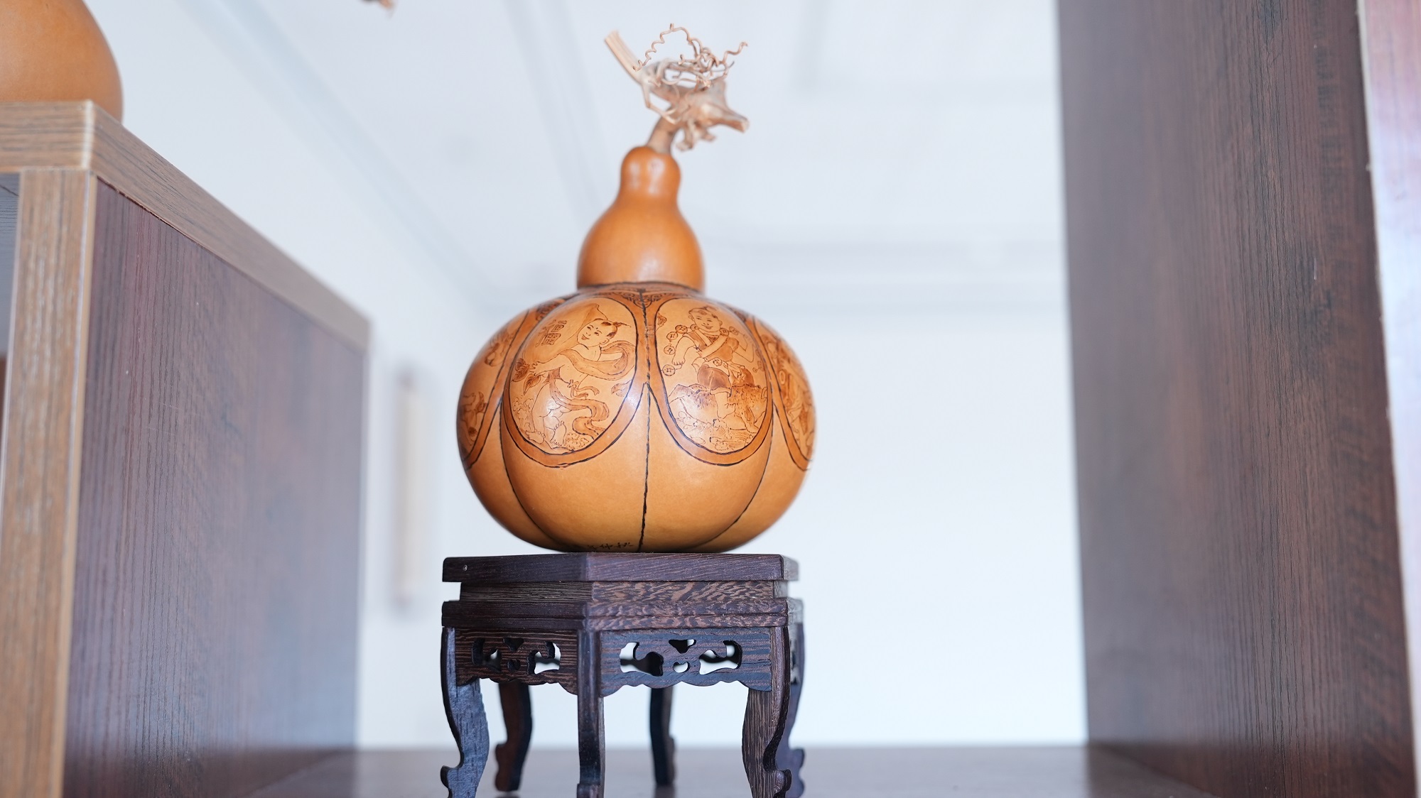 葫芦,谐音“福禄”,寓意幸福、美好、吉祥。葫芦烙画,又称烫画、火笔画,是一种特色传统工艺美术品,也是中国非物质文化遗产,是通过电烙铁在葫芦上熨出烙痕再上色作画。它不仅有中国画的勾、勒、点、染、擦、白描等手法,还可以熨出丰富的层次与色调,在把握火候、力度的同时,注重“意在笔先、落笔成形”,勾勒出的山水、花鸟、人物等丰富多样的图案,有很强的立体感,以其独特的艺术魅力流传至今。