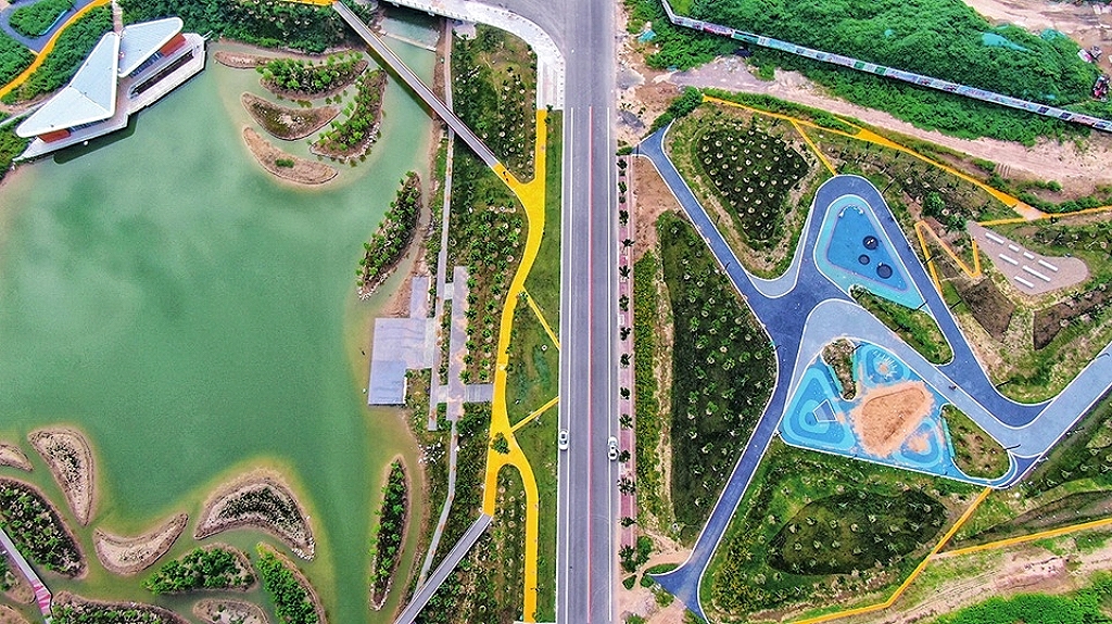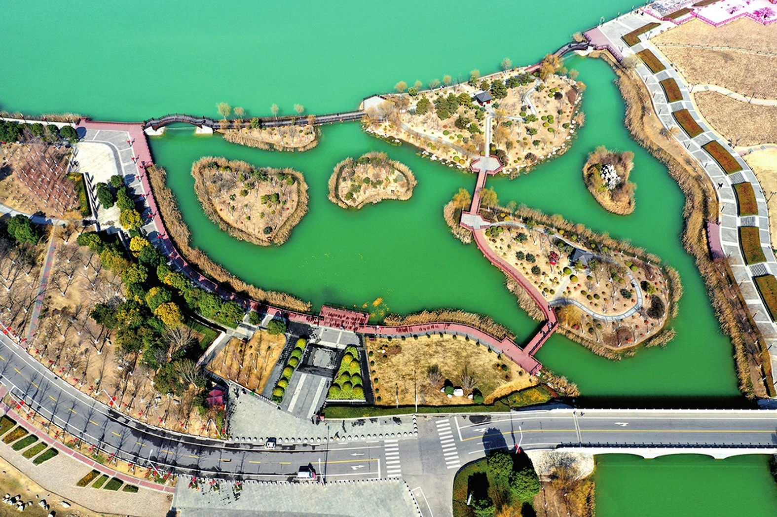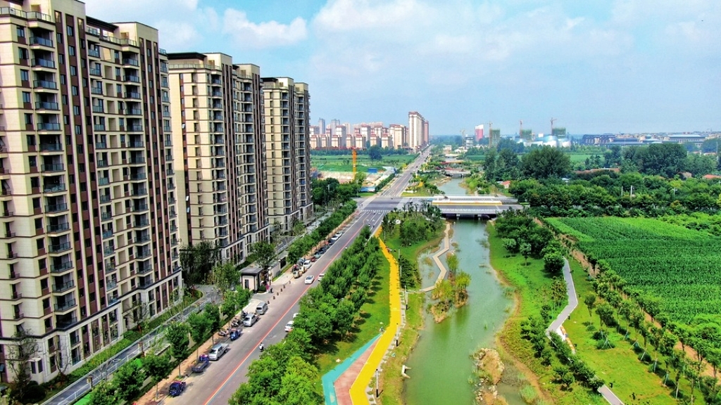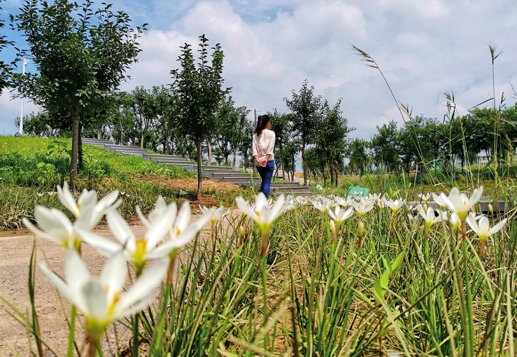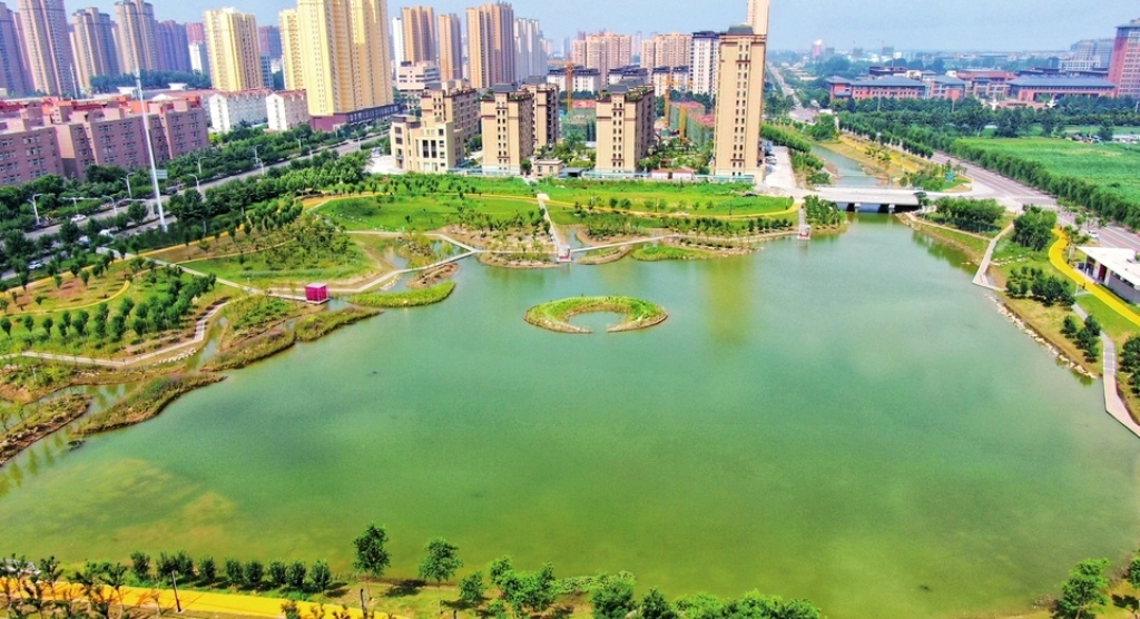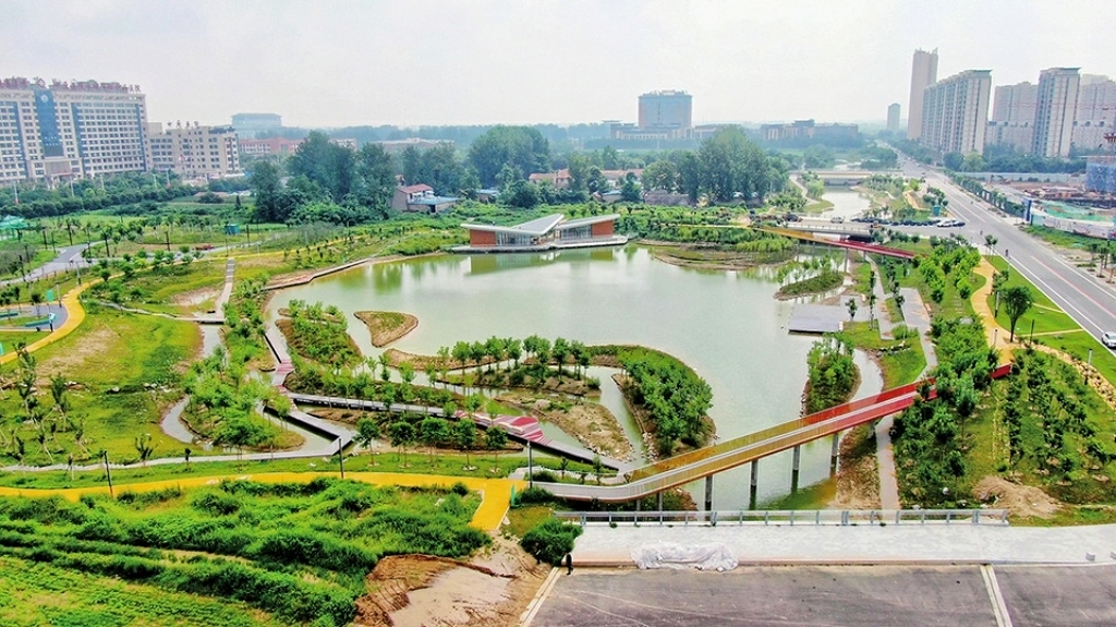 以水润城映人和。河系蜿蜒穿城,似灵动绸带,两岸绿树繁花。永城市通过城水相依、灵韵秀美的城市生态水系的建立,构建了生态系统良性循环、人居环境明显改善的美好图景。