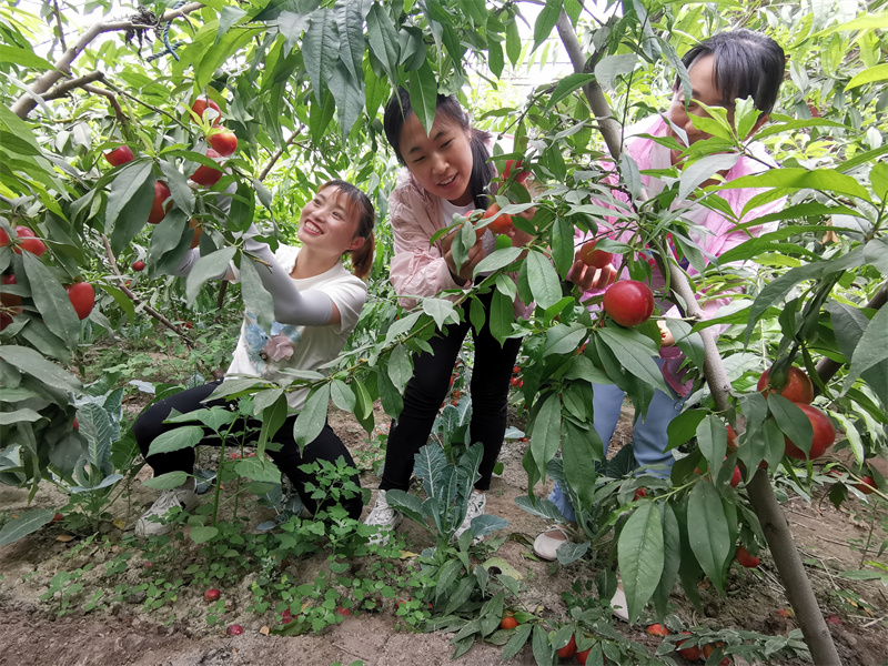 初夏时节,走进新疆维吾尔自治区巩留县牛场片区鑫牛社区的大棚油桃种植基地,鲜红饱满的桃子在绿叶的衬托下,让人垂涎欲滴。种植户和志愿者正在采摘桃子,显得格外忙碌,让油桃抢“鲜”上市,一颗颗油桃成为了增收致富的“幸福果”。