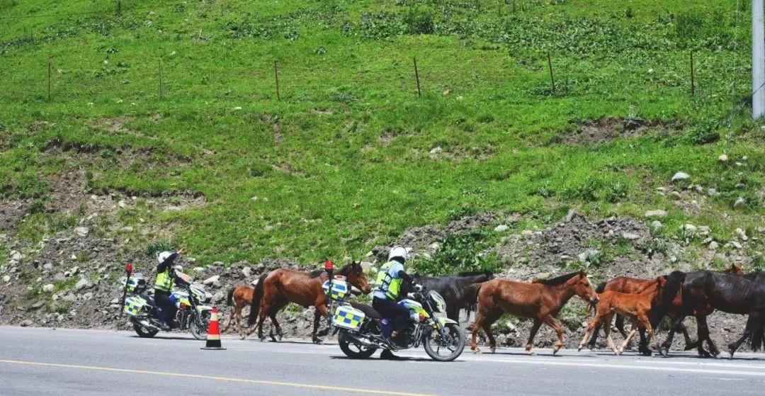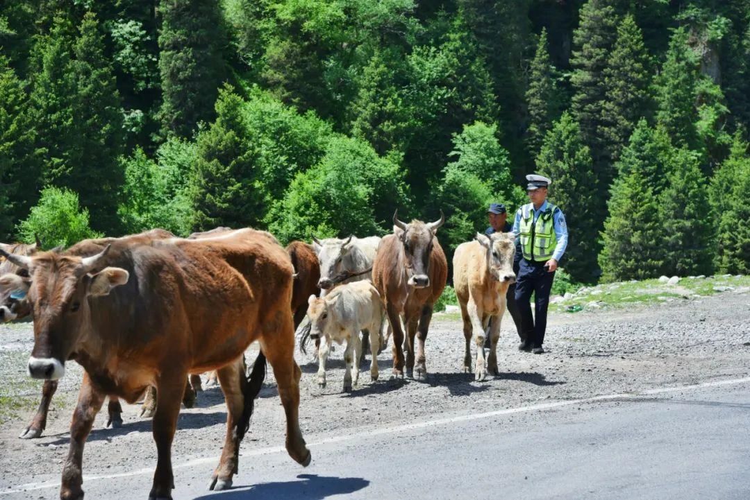 护牧助民凝聚合力,共绘和谐图景。执勤中,民警化身“护牧员”,耐心引导穿越公路的牛羊群,保障道路畅通的同时守护牧民利益。这份主动担当,赢得了群众广泛好评,生动诠释了警民同心、共护平安的和谐氛围,为独库之旅增添暖心底色。