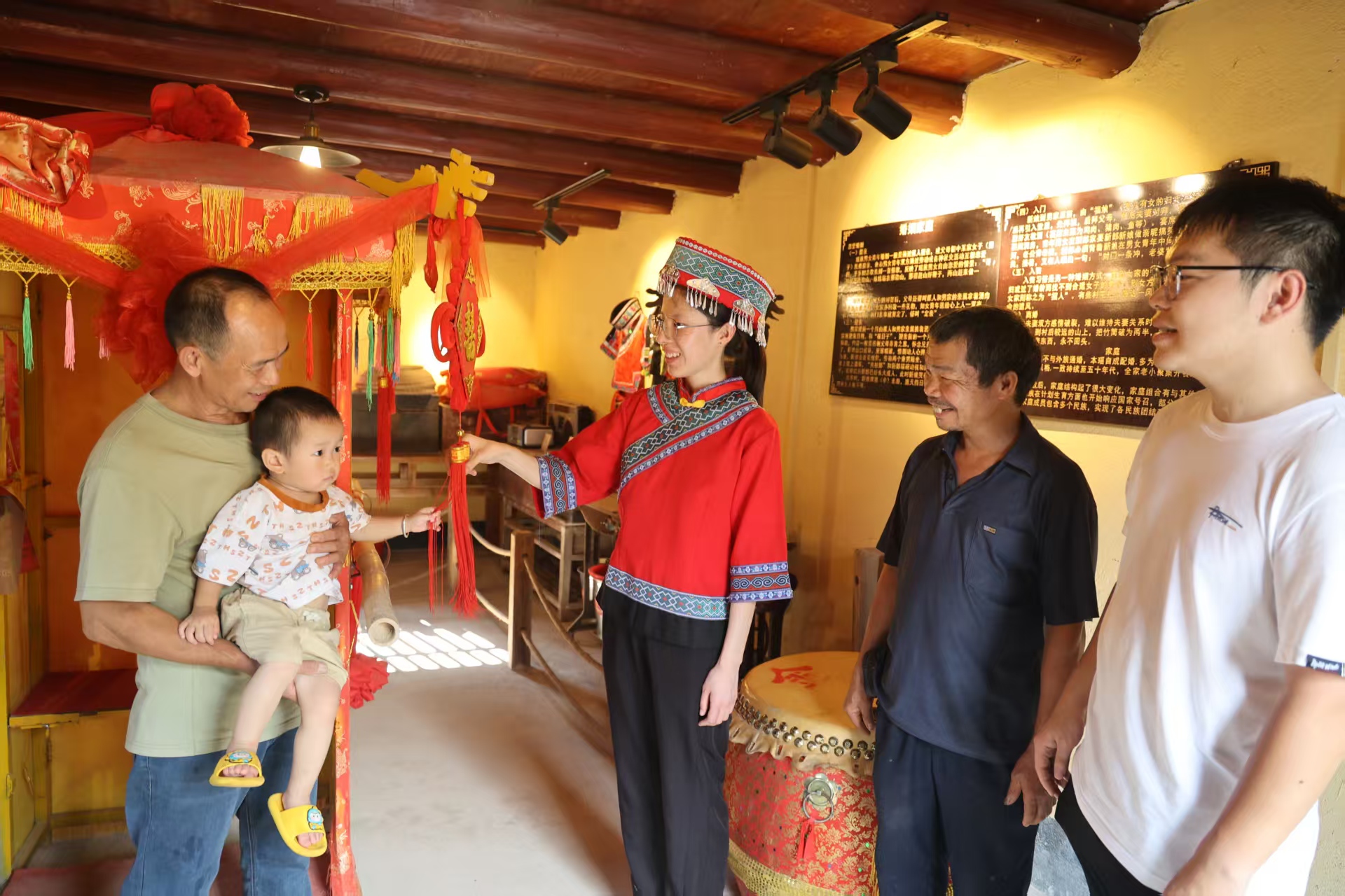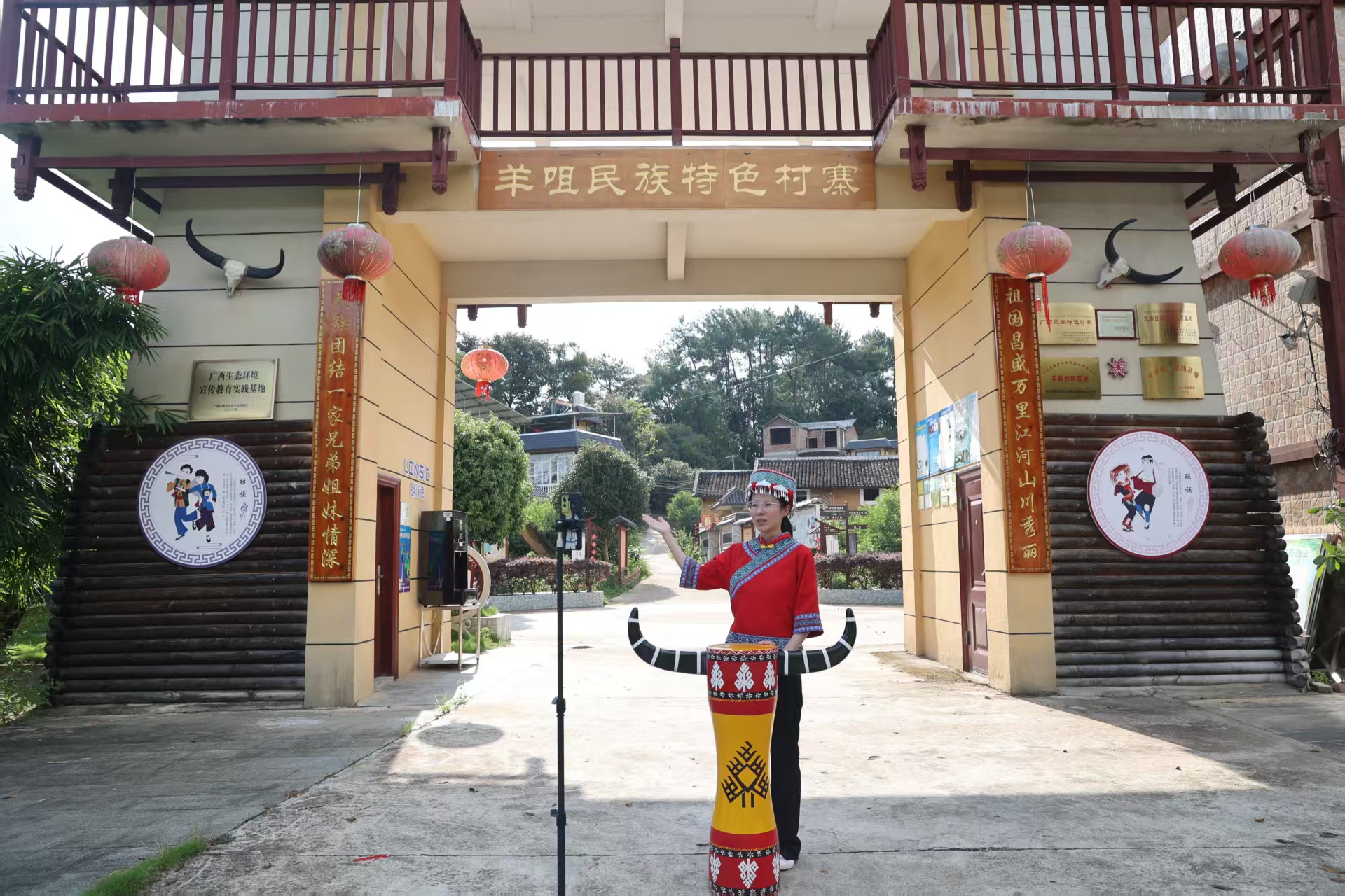 阳光明媚的古瑶寨晒坪上,党员选调生蒋小梅身穿绚丽瑶族盛装,笑容灿烂。她手持饱满圆润的平乐盐菜,桌面上堆满色泽诱人的桃胶、柿饼、石崖茶等平乐特色农产品。驻村工作队员正用镜头捕捉这充满民族风情的画面,背景是民族特色村寨和古朴的木楼。
