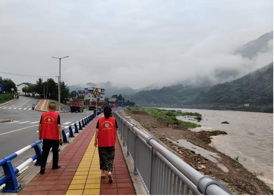 竹园镇党员干部加大对河堤、桥梁等重点设施和交通道路的巡查力度,通过村村响、微信群等方式传达预警信息和开展警示宣传,提高群众自我防范意识,提醒群众尽量减少外出,远离危险区域。
