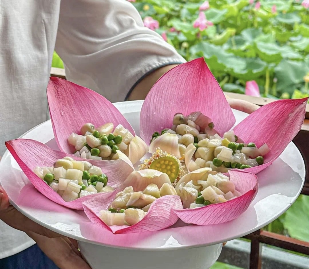 法泗街素有“江南粮仓 荷韵水乡”的美誉,荷花基地位于江夏区法泗街斧头湖畔,目前已建成占地面积万余亩的现代荷花观光园区,每年6月至9月是赏荷采莲的最佳时期。游客可于荷塘中央的栈道漫步赏荷,打卡拍照,也可乘坐小船前往荷塘深处,体验采摘莲蓬的乐趣。赏荷采莲之后,还可以前往当地农家小院品味“荷花宴”。鲜香酥脆的“炸荷花”、清香软糯的“荷叶斩蛋”、清脆爽甜的“荷塘三宝”……这条以“荷”为主的产业链,既增加了法泗街的知名度,也带动了周边村民从种苗培育到销售的全链条就业,每年为村集体增收15万余元。