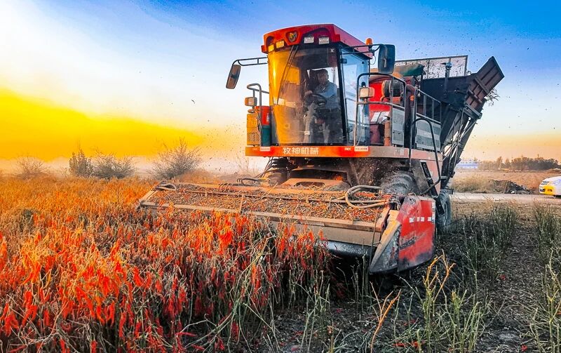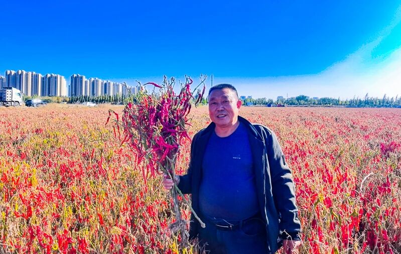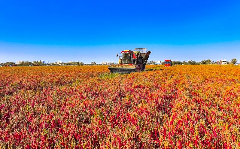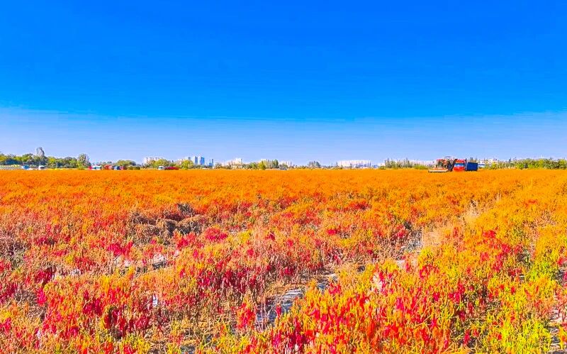 金秋时节,新疆乌鲁木齐高新区(新市区)安宁渠镇西村的百亩辣椒基地里,红似火的线椒挂满枝头,放眼望去,整片椒田铺展成一片绚烂的红色海洋,远处农机在田间穿梭作业,与湛蓝的天空、错落的城镇建筑相映成趣,勾勒出一幅红椒满枝、机械助收、产业兴旺的乡村振兴丰收画卷,生动演绎着特色农业赋能强村富民的鲜活实践。