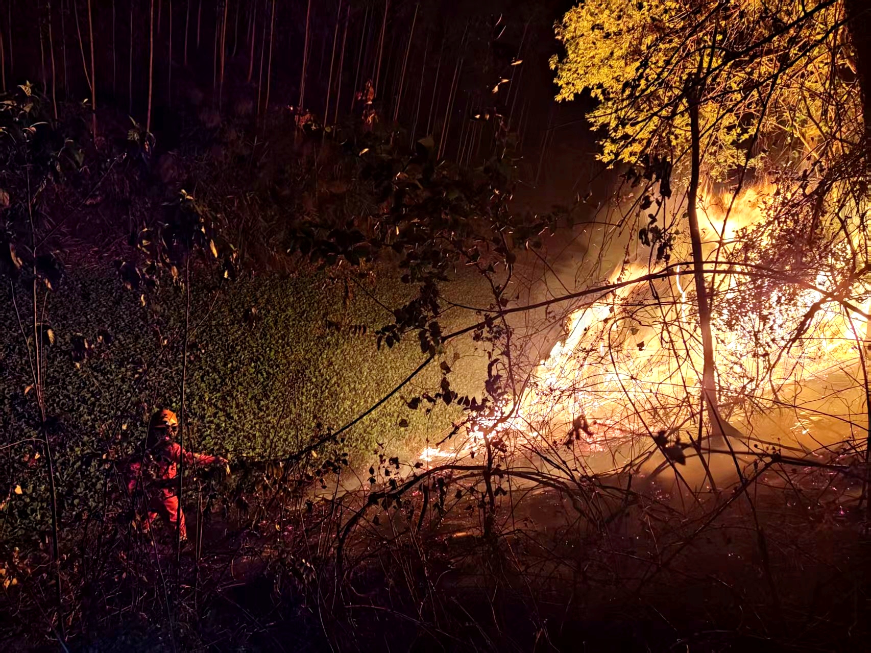 一次深夜接到火警,我们迅速背起灭火机、灭火拖把等灭火装备就往山里赶。火光映红半边天。我问同行的消防站宋副站长:“这次难灭吗?”他盯着火线:“杂藤厚,枯叶多,难。”没有多余的话,十几个人逆着风,在灼热的气浪里开辟隔离带。